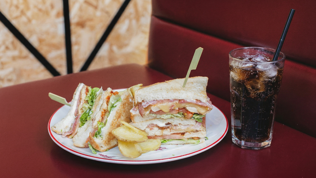 Club con pechuga de pollo, bacon, jamón york, lechuga, tomate, queso fundido y mayonesa 13,45€